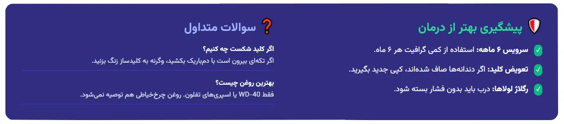 - سرویس ۶ ماهه: هر ۶ ماه یکبار، مقدار کمی پودر گرافیت یا اسپری خشک سیلیکون داخل قفل بزنید.